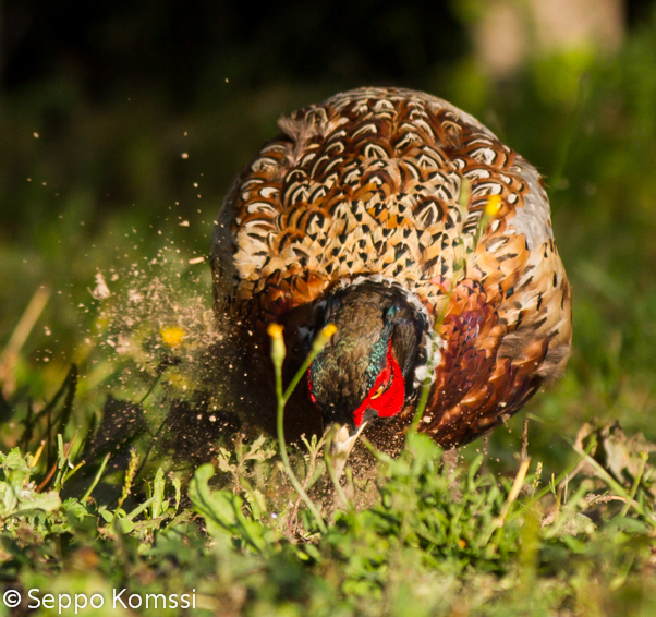 Fasaani ottaa multakylpyä. Phasianus colchicus.